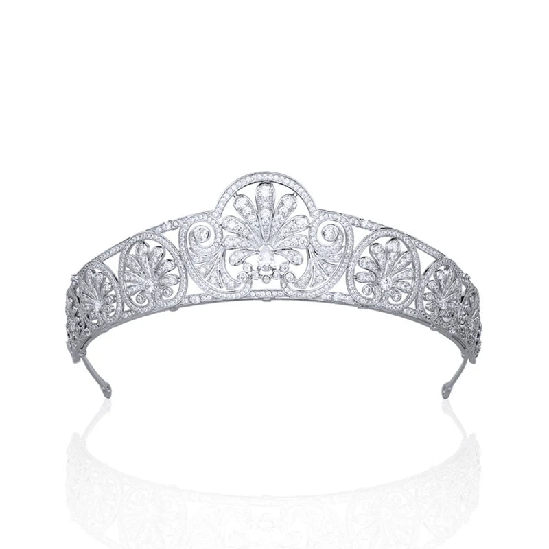 A zinc alloy tiara, plated in silver-toned metal with cubic zirconia, that mimics The Duchess of Gloucester's honeysuckle tiara.